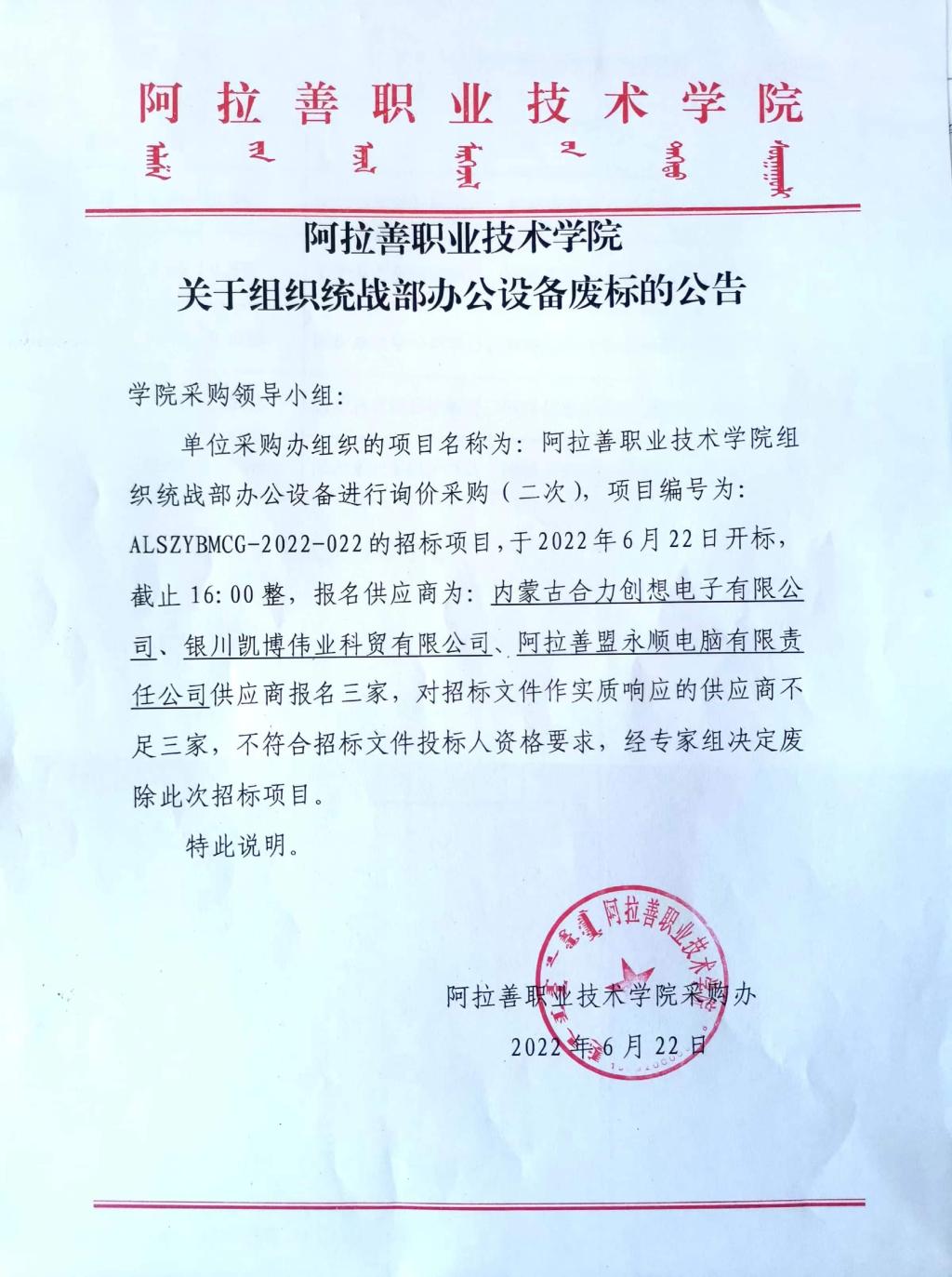 关于组织统战部办公设备废标的公告
