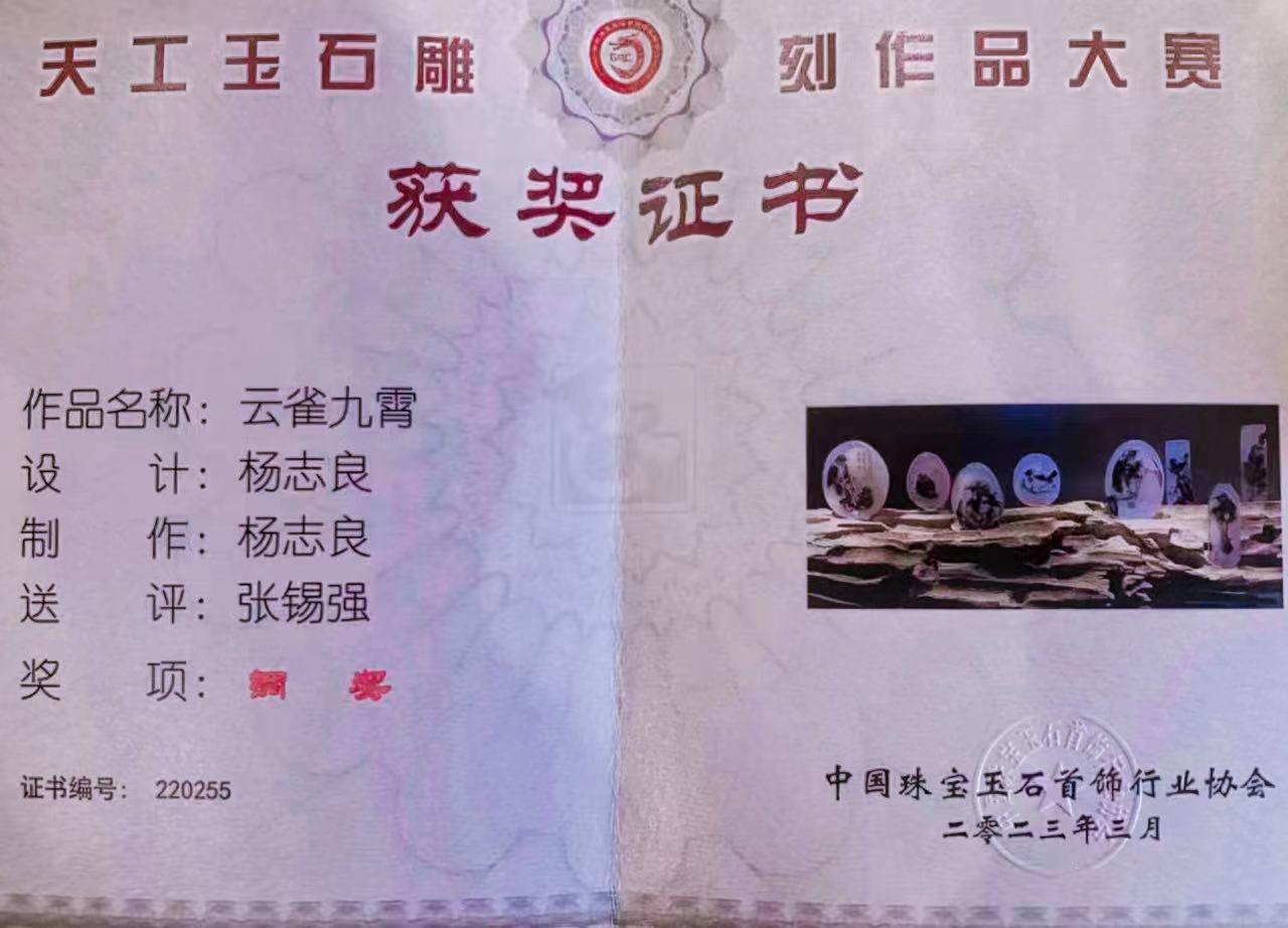3月16日,由中国珠宝玉石首饰行业协会和珠宝玉石首饰国检集团联合主办的中国国际珠宝展开幕,公布了2022天工玉石雕刻作品大赛结果,我系雕刻艺术设计专业教师杨志良的玉雕作品《云雀九霄》在全国数万件玉雕作品当中脱颖而出,荣获“天工奖”玉石雕刻类铜奖。