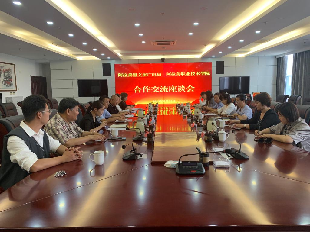 会上,学院相关部门负责人就各部门的基本情况、发展规划做了介绍。阿盟文旅广电局相关负责人介绍了各自的业务特色及合作意向,双方围绕非遗文化项目传承、人才培养、数字图书资源共享、文旅产品开发等方面进行了深入交流。