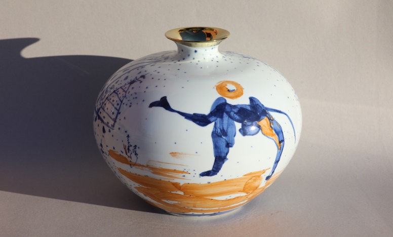 曼德拉岩画与青花瓷的“浪漫之约”。哈斯鲁老师是艺术系艺术研究学博士,他独具匠心的将阿拉善曼德拉岩画用青瓷的烧制工艺,以新的视角在瓷器上展现出来。采用1200度高温的烧制方式,使得瓷器表面呈现一层青色釉面,再用纯金粉二次创作800度烧制完成作品。作者将中国南方瓷器文化与北疆文化巧妙地融合,使阿拉善曼德拉岩画在当代艺术舞台上焕发新的生命力,体现了中华文化交往交流交融的多元一体格局。