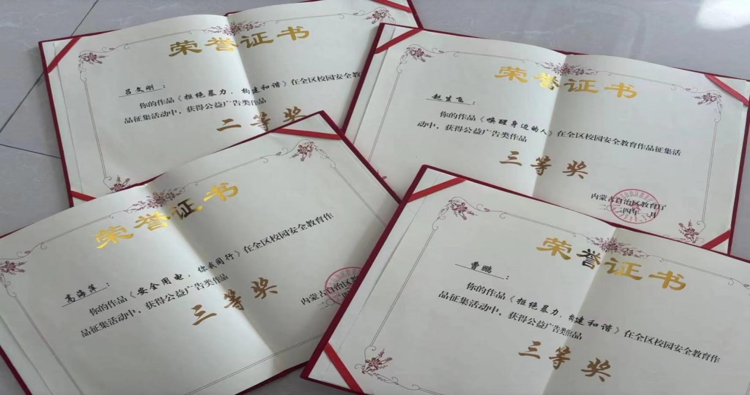 通过指导老师的精心辅导,在学生的认真准备下,艺术系艺术设计班同学设计制作的海报获得1个全区二等奖、3个全区三等奖。其中,学生吕文刚、曹鹏的作品《拒绝暴力、构建和谐》入选《内蒙古自治区校园安全教育作品征集活动优秀作品集》。
