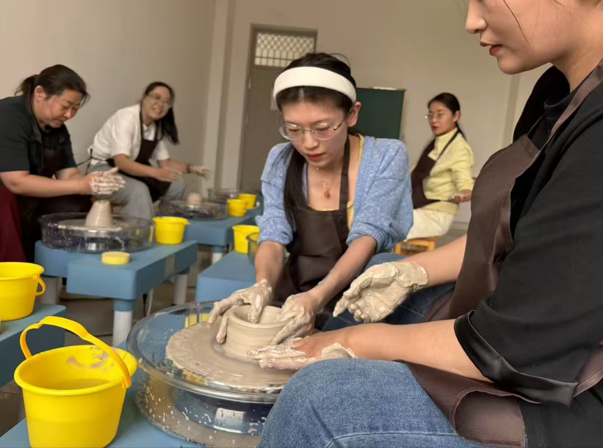 在培训中,苏丹宁老师从专业角度系统讲解了拉坯工艺的要领,包括陶土特性分析、拉坯机操作规范、塑形技巧等,并结合教学实际,分享了如何将传统工艺与现代审美相结合的教学经验。实践环节中,教师们热情参与,从揉泥、定中心到拉坯成型,亲身体验陶艺制作的完整流程,并就教学中的常见问题进行了深入交流。