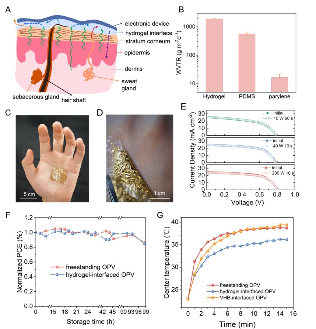 水凝胶的高水蒸气透过率(WVTR)保证了其作为皮肤/电子界面的透气性,允许几乎不受阻碍的经表皮水分流失(TEWL),从而在贴附电子器件的情况下,人体皮肤和外部环境之间仍然保有自由的水蒸气交换。团队以超薄水凝胶作为界面,展示了多种有机薄膜器件(包括柔性场效应晶体管、电化学晶体管和太阳能电池)与皮肤集成的可能性,记录了以超薄水凝胶为界面的柔性电子器件在手背贴附长达一周,未见有明显过敏反应或皮肤刺激。此外,带有水凝胶界面的柔性太阳能电池在99小时内稳定运行,且水凝胶较大的比热容可降低太阳光长久照射和器件持续工作造成的局部温度过高,为穿戴带来更为舒适的感受(图4)。