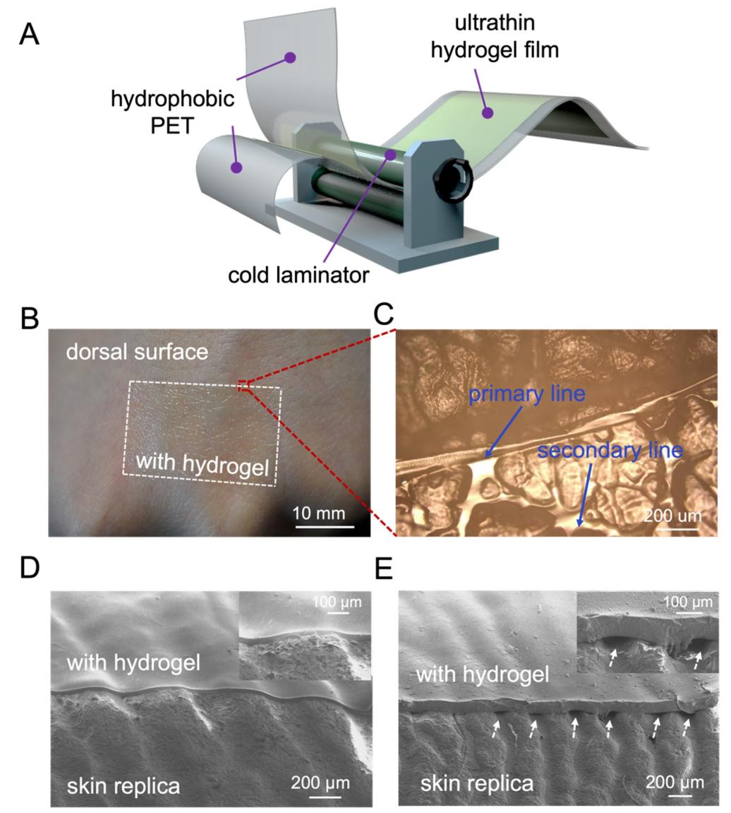 图2.超薄水凝胶的制备及不同厚度水凝胶对皮肤纹理的贴合程度对比
