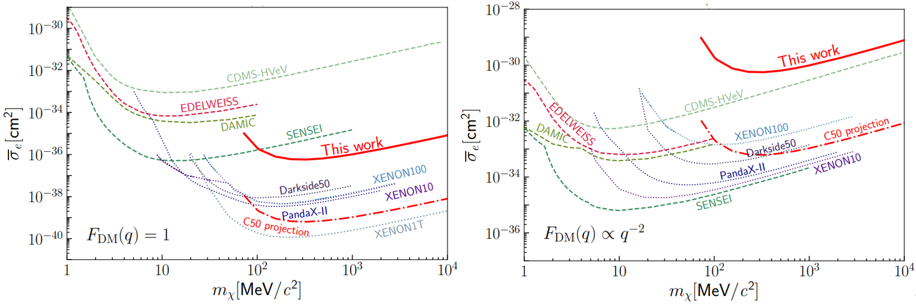 图3.CDEX-10给出的暗物质-电子相互作用灵敏度限制。左图:重媒介子情况下CDEX-10给出的排除线,在质量大于100MeV的暗物质质量区间内,给出了国际上主流的基于固体探测器的暗物质-电子相互作用直接探测实验中,对暗物质-电子相互作用截面最灵敏的限制;右图:轻媒介子情况下CDEX-10给出的排除线