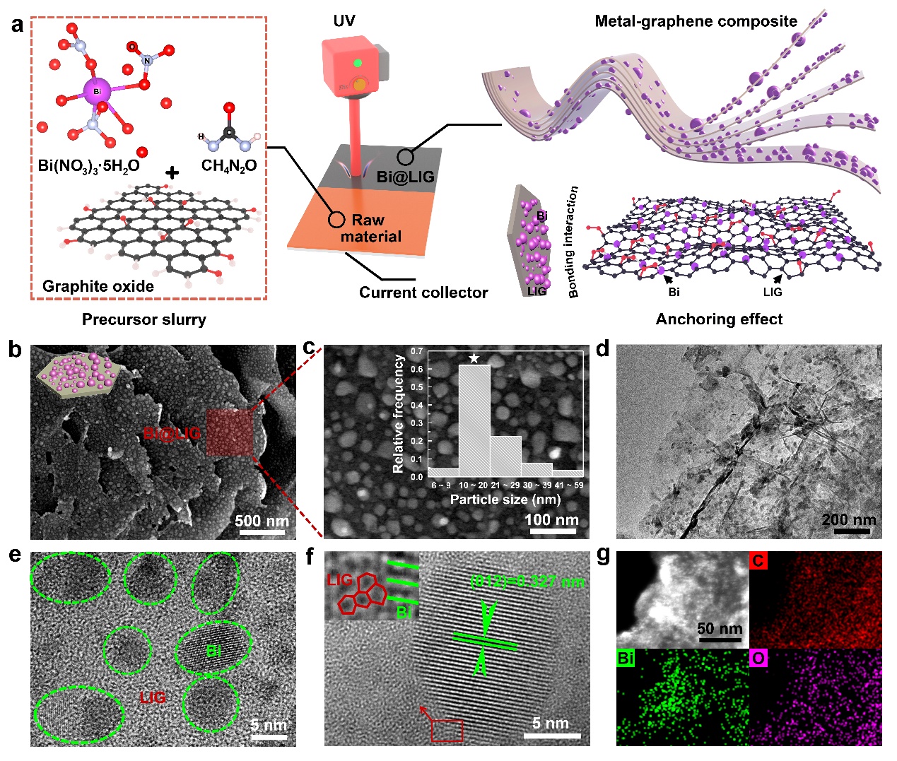 图1.紫外激光诱导的Bi@LIG负极复合材料制备示意图及铋纳米颗粒的锚定