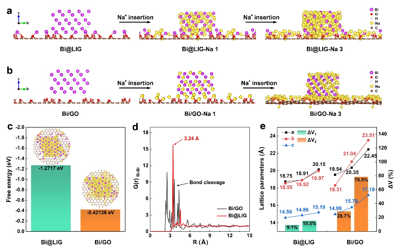 研究人员还通过引入常见的碳物理混合策略的对照样品Bi/GO,与本文提出的激光诱导的化学键增强的Bi@LIG在分子动力学模拟层面进行结构计算,得出了在逐步嵌入钠离子后不同状态下铋-铋金属键长以及对应的体积膨胀率,基于对两种形式的碳支撑纳米结构的综合分析,说明“镶嵌式”的金属铋-石墨烯复合结构有效地限制了充放电过程中产生的体积膨胀,在经历长循环后仍能保留结构的完整性(图2)。该研究对利用激光脉冲沉积技术实现金属负极的普适化碳复合有着重要的借鉴意义。