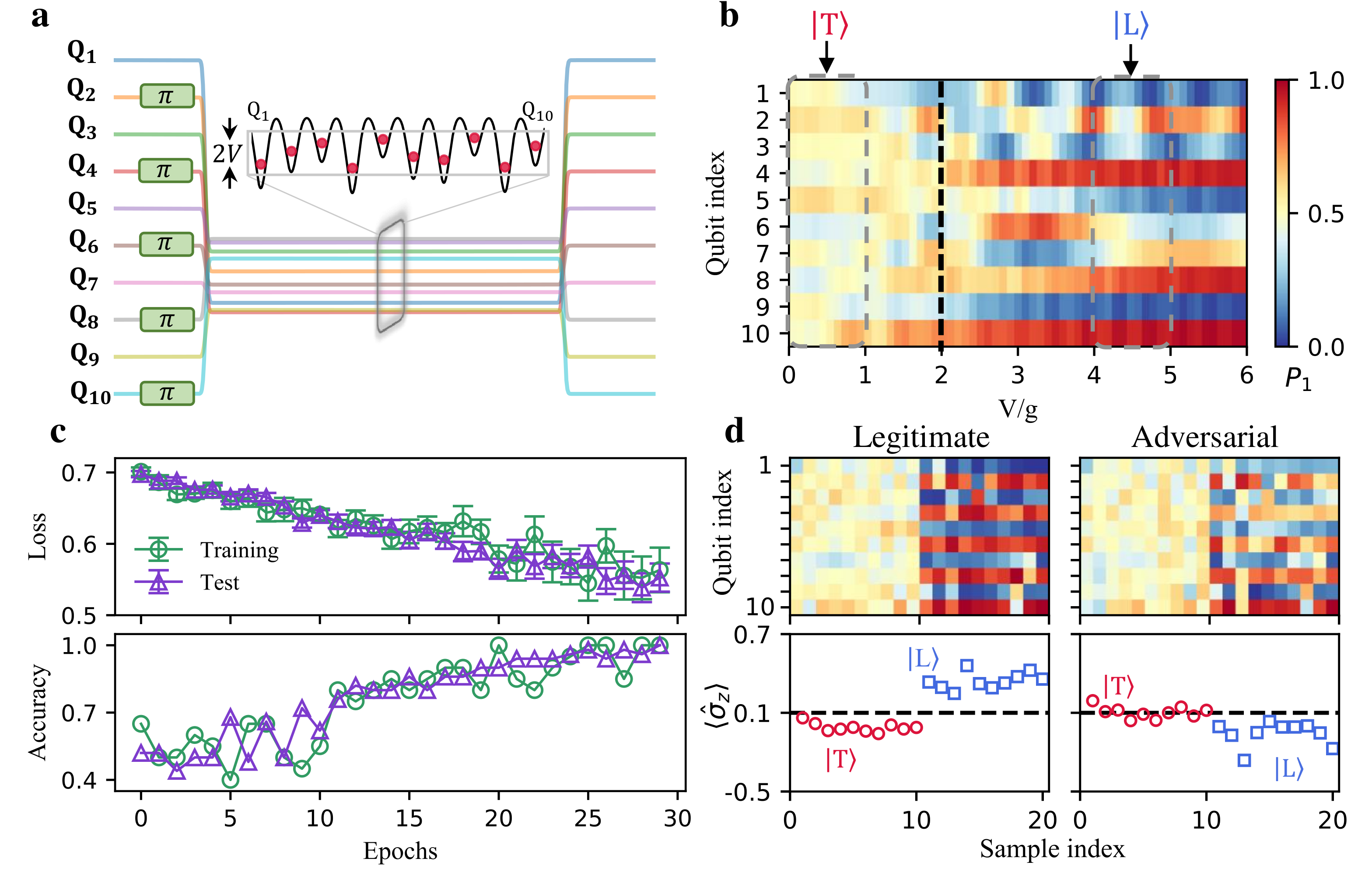 在量子机器学习领域,近年来的理论工作展示了在某些特定的任务下,量子分类模型和生成模型相对于经典模型具有可证明的、有复杂性理论保证的优势。最近两年,量子对抗机器学习的概念也被提出并受到了广泛关注。然而,在当前中等规模带噪声(NISQ)量子设备上演示量子学习模型面对对抗攻击的脆弱性和防御手段还面临诸多挑战。该研究中,beat365中文官方网站交叉信息研究院邓东灵团队设计了处理经典数据和量子多体态数据的学习模型,并与浙江大学超导量子计算团队合作,首次在量子设备上成功实现了高维数据的学习、对抗攻击脆弱性的揭示以及相应防御手段的展示。