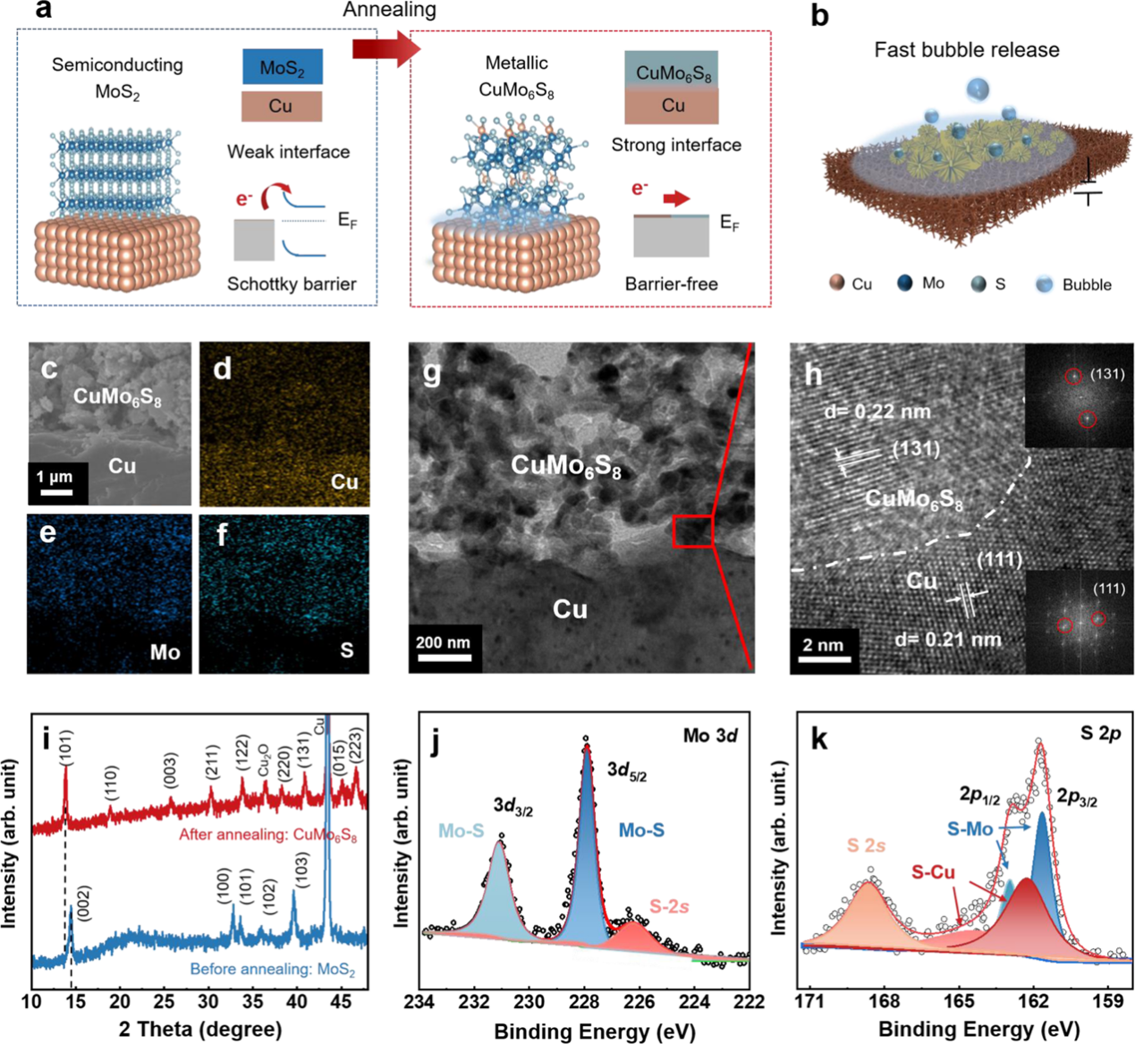 近日,beat365中文官方网站深圳国际研究生院刘碧录团队创制出一种基于双界面设计的同源金属电极。该电极以优化催化剂与基底以及催化剂与气泡的双界面为出发点,解决了大电流密度制氢下的传质、界面力学、界面电导三大难题。这种同源金属催化剂通过MoS2和Cu的原位高温反应制备,将半导体相MoS2转成具有金属性质的Chevrel相CuMo6S8,这种一体化结构有效消除了半导体-金属接触的界面肖特基势垒。由于电极表面催化剂与基底具有强的化学键结合,且电极展现出全金属性质以及超亲水状态,因此有效提升了催化剂/基底界面结合力并降低了催化剂/气泡界面粘附力,在增强电极稳定性的同时加速了析氢反应的动力学,展现出优异的电催化析氢性能。该电极在2.5 A cm-2下仅需321mV的过电位,在1 A-2.5 A cm-2级别的大电流密度下稳定运行300小时性能无衰减。此外,前驱体MoS2可取自天然矿石辉钼矿,成本比贵金属铂降低2-5个数量级,与目前的大电流密度催化剂相比具有更大的成本优势。