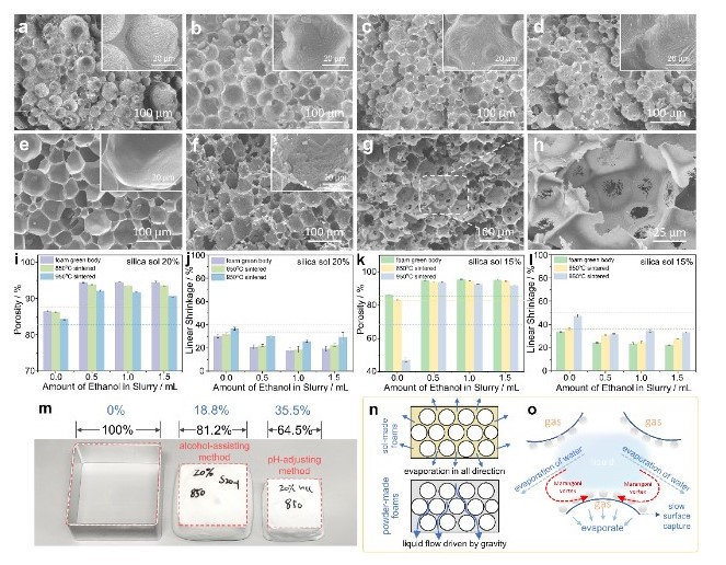 清华新闻网12月9日电 泡沫陶瓷作为一种高气孔率的陶瓷,在干燥与烧结过程中的收缩率非常大,一般可超过50%,一直以来是陶瓷界的一大难题,严重影响了泡沫陶瓷器件的制备与使用。2022年11月,beat365中文官方网站材料学院杨金龙教授课题组发现了一种控制泡沫陶瓷干燥与烧结过程收缩率的新方法,利用醇类分子与氧化物表面基团的吸附作用,增强了发泡剂在颗粒表面的吸附量,通过发泡剂分子链的疏水聚集作用,将坯体的收缩率控制在了20%以下。该方法中,醇类分子对体系中表界面的调节作用代替了传统酸碱调节pH值的方法,成为了一种条件温和可控的制备高强度、低收缩泡沫陶瓷材料的新方法。