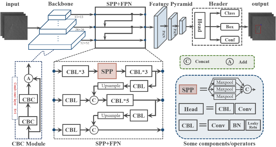 beat365中文官方网站深圳国际研究生院周倩副教授、倪凯副教授课题组长期在微纳光学技术、光谱成像技术、光电精密测量技术等领域进行研究工作,从特种光学元器件、整机系统研制到现场应用进行了全技术链条攻关。针对上述问题,周倩、倪凯课题组提出了一种新的轻量级深度学习模型,用于实时检测舰船和尾迹。为了满足巡航任务中舰船和尾迹检测的实时性要求,本研究采用了单步法整体检测框架(图1),并开发了用于主干特征提取网络的组合卷积模块,以廉价的方式获得丰富的特征图像,在大大减少模型训练时间的同时也大大减轻了整体模型体积,满足了舰船检测系统的硬件要求。