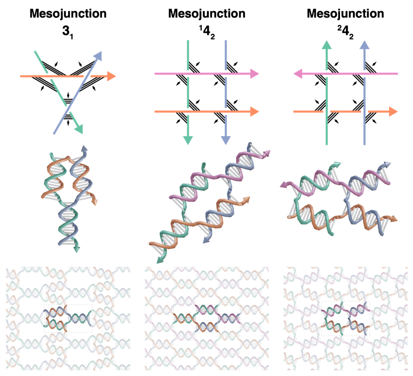 清华新闻网1月22日电 四十年前,纳德里安·西曼(Nadrian C. Seeman)教授以分支交叉(branchjunction)为基础,开创了DNA纳米技术领域的先河。四十年来,DNA纳米技术蓬勃发展,可以精准实现各种复杂二维及三维图案或形状的自组装,而结构模块大多依照普通交叉(regular junction)来设计。早在上世纪90年代初,由西曼教授同时提出的另一DNA模块类型——混合交叉(mesojunction),却被研究者忽视和遗忘。虽然混合交叉的部分单元设计已在实验中得到初步验证,但是后续相关的研究长期以来近乎停滞。