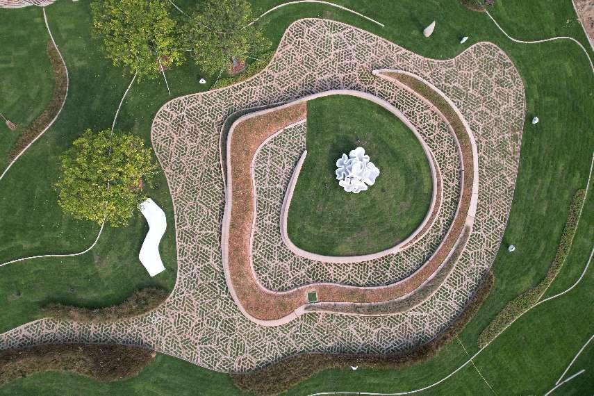 产品打印完成后,经过三天左右的自然养护即可进行安装。团队针对每种产品进行了必要的安装构造及吊装设计,并与现场施工团队配合,完成了打印产品的定位、吊装、构造连接、勾缝、表面处理等后续工艺。由于3D打印产品的精度较高,安装缝隙较小,减少了现场湿作业的工作量。之后,结合整个场地的设计概念进行绿化种植,自然起伏的地形表面覆盖柔软浓密的草坪,数棵高大的乔木点缀其中,环境饰品及园林小品展现出自然有机的生态美感。