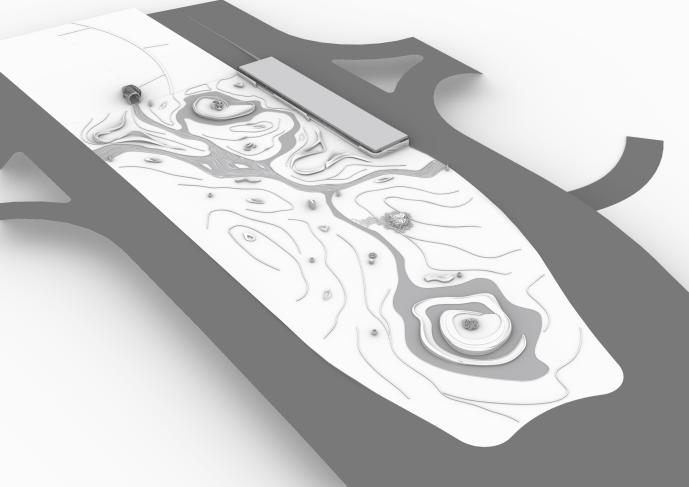 园区内所有3D打印景观小品以“水”的灵动作为原初设计思想,突出机器人3D打印混凝土技术在建造特殊曲面造型时的优势;在绿意盎然的草地上,通过算法生成的3D打印道路如同水流活泼奔涌,自然地将游人引向各个景观点;在高低起伏的道路之间,有机地形成大大小小的“岛屿”,有些是3D打印的雕塑景观平台,有些是3D打印的花坛与座椅结合的休闲空间,有些布置了3D打印的环境饰品。
