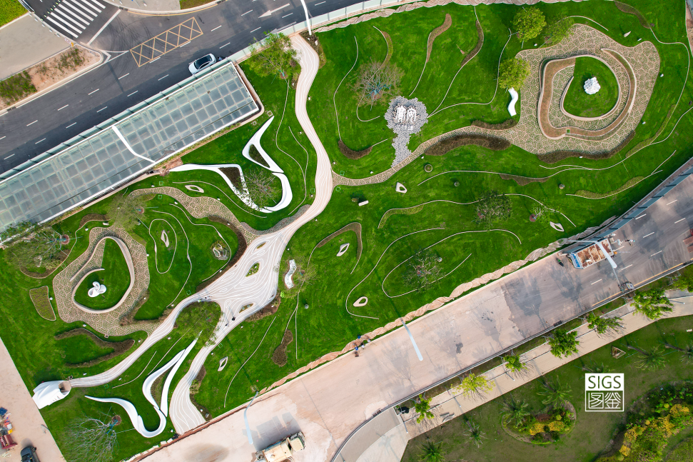 公园的设计概念为“溪谷清流”,蜿蜒的道路曲线和自然起伏的地形融合在一起,模拟清泉流淌于溪谷间的形态,造型生动灵活的园林小品与水平延展的地形完美结合,创造出独特的自然空间。
