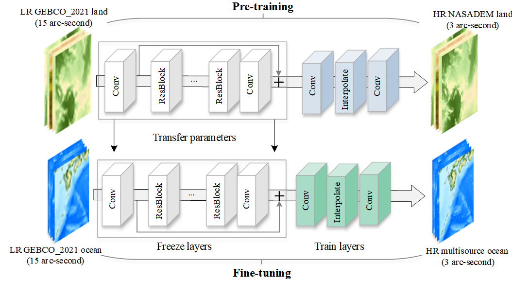 该研究基于30 m分辨率的美国国家航空航天局(NASA)DEM卫星影像、联合国政府间海洋学委员会的450 m分辨率GEBCO_2021公开数据和部分区域高分辨率海洋地形数据,采用深度残差预训练神经网络和迁移学习(Transfer Learning)相结合技术,构建了适用于全球区域的DEM-SRNet模型,制作了全球3弧秒(90 m)分辨率的海陆DEM产品GDEM_2022。