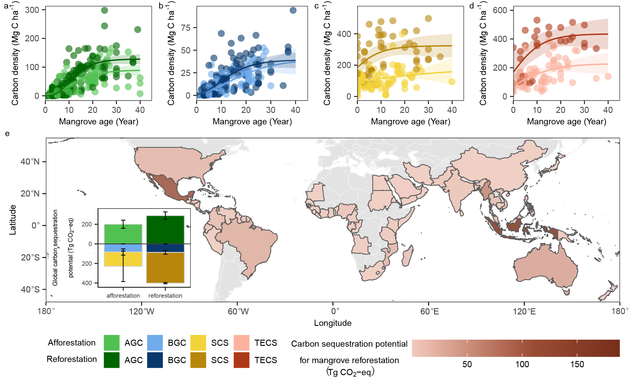 近日,上述研究成果以“修复红树林系统在减缓全球气候变化和碳吸收方面显著优于滩涂”(Mangrove reforestation provides greater blue carbon benefit than afforestation for mitigating global climate change)为题,发表在国际知名期刊《自然·通讯》(Nature Communications)上。