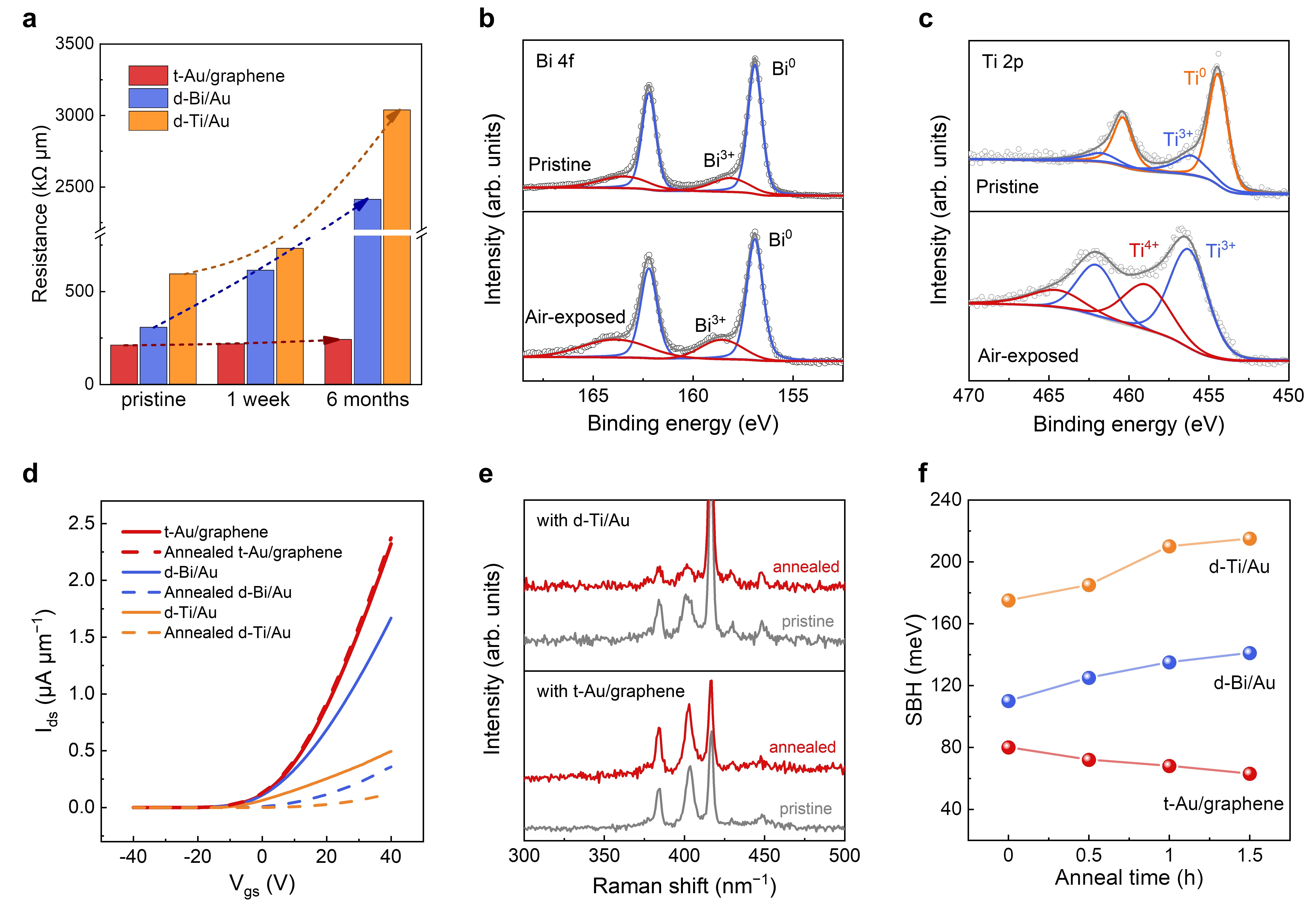 在过去的十几年中,数十种TMDCs材料在纳米电子学方面得到了广泛的探索。相关学者发现电极-TMDCs界面对二维半导体器件的电输运特性具有关键影响。例如,传统金属电极的沉积可能会破坏超薄的二维TMDCs薄膜,并在电极-TMDCs界面上引入缺陷,产生费米能级钉扎现象和高肖特基势垒,从而退化器件的电学性能;在高温等环境下,金属会进一步往有缺陷的沟道材料上扩散,降低器件的开关比(图1a)。因此,近年来人们开发了许多降低势垒高度来提升器件性能的策略,包括使用低功函数金属、插入缓冲层和转移金属电极。然而,这些方法并不能克服纳米器件在苛刻环境中的电极界面失效问题。例如,在TMDCs器件中用作电极缓冲层的低功函数金属,如Ti、In和Bi,在空气中甚至较高真空下容易氧化,在高温下这些金属缓冲层的氧化会加剧并与有缺陷的TMDCs薄膜反应,从而降低器件稳定性。
