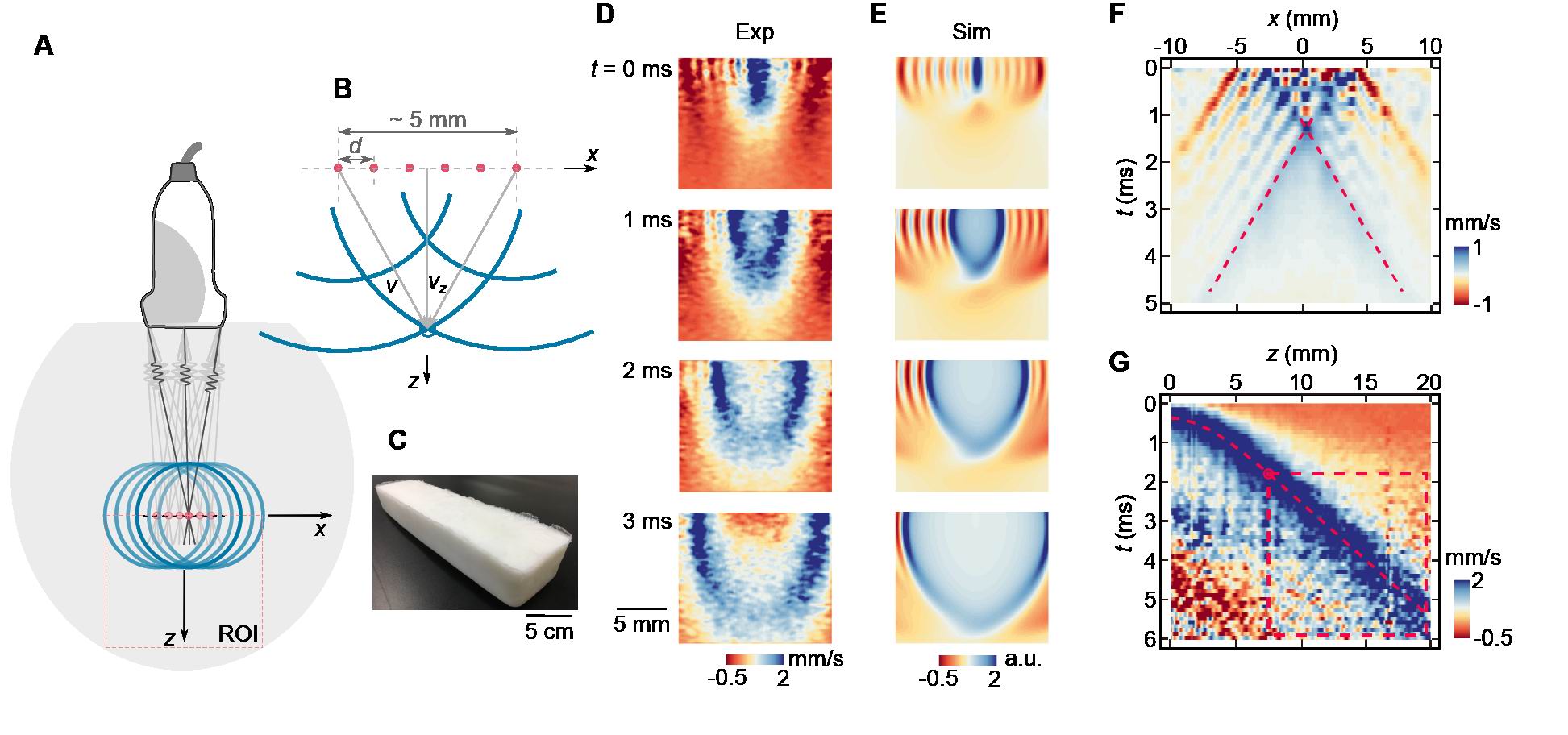 图1.基于声辐射力编程实现在软材料内部激发沿不同方向传播的剪切波,以及采用超声剪切波弹性成像系统测量得到剪切波速度。(A)实验中所采用的激励方式。超声波束沿着x轴从左至右先后聚焦在材料内部间距约1mm的六个位置。除水平方向剪切波以外,剪切波在z方向发生相长干涉形成纵向偏振剪切波。通过超快平面波成像测量得到剪切波在感兴趣区域(ROI)内的传播过程。(B)剪切波相长干涉形成纵向偏振剪切波。(C)实验采用的水凝胶样品。(D)不同时刻ROI内的剪切波。(E)有限元仿真。(F)水平和(G)竖直方向剪切波质点速度的时空场。通过Radon变换计算其群速度