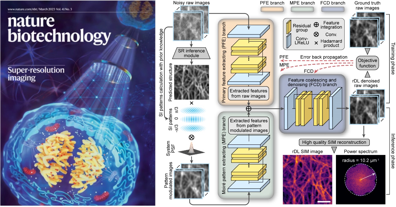 近日,上述成果在《自然·生物技术》(Nature Biotechnology)期刊发表题为“基于合理化深度学习超分辨显微成像的快速、长时程活体亚细胞过程观测”(Rationalized deep learning super-resolution microscopy for sustained live imaging of rapid subcellular processes)的论文。《自然·生物技术》杂志以封面文章的形式对这一研究成果进行报道,同时发表了《研究简述》(Research Briefing)文章对其重点介绍。