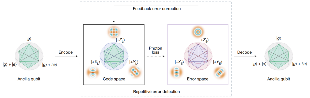 为攻克上述难题,联合研究团队利用微波简谐振子或玻色模式系统中的无穷维希尔伯特空间,实现量子信息的冗余编码与量子纠错。在超导量子线路系统中,基于玻色编码的量子纠错方案具有错误类型简单、错误探测方便、相干性能好、硬件更高效、反馈控制易实现等优点。该研究中,研究团队通过开发高相干性能的量子系统,设计和实现低错误率的错误症状探测方法,以及改进和优化量子纠错技术等实验手段,最终在玻色模式中实现了基于离散变量的二项式编码的逻辑量子比特,并通过实时重复的量子纠错过程,延长了量子信息的存储时间,相关结果首次超过该系统中不纠错情况下的最好值,也就是突破了盈亏平衡点。这也是国际上首次通过主动的重复错误探测和纠错过程实现延长量子信息的存储时间超越盈亏平衡点,具有里程碑式的重要意义。