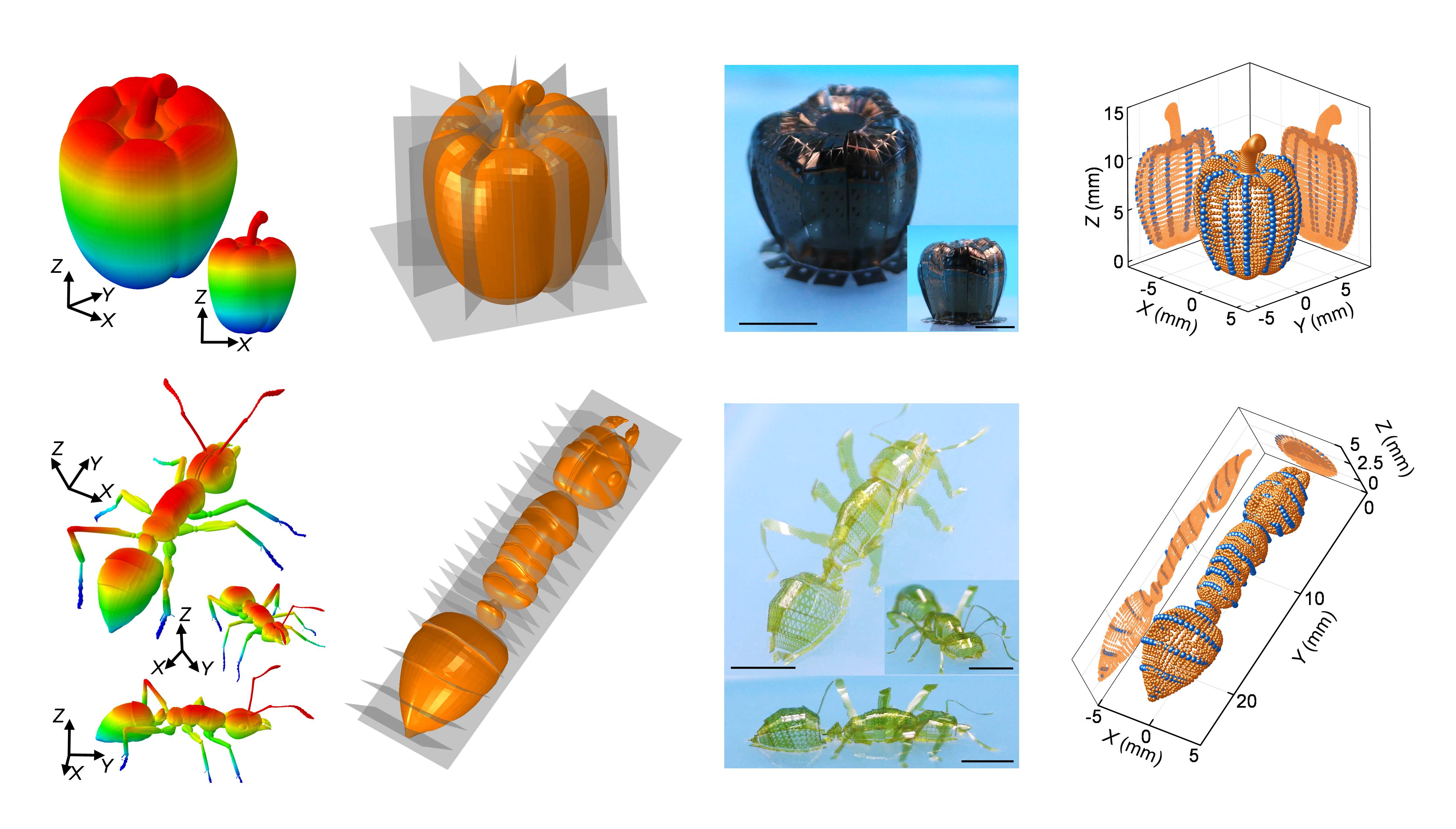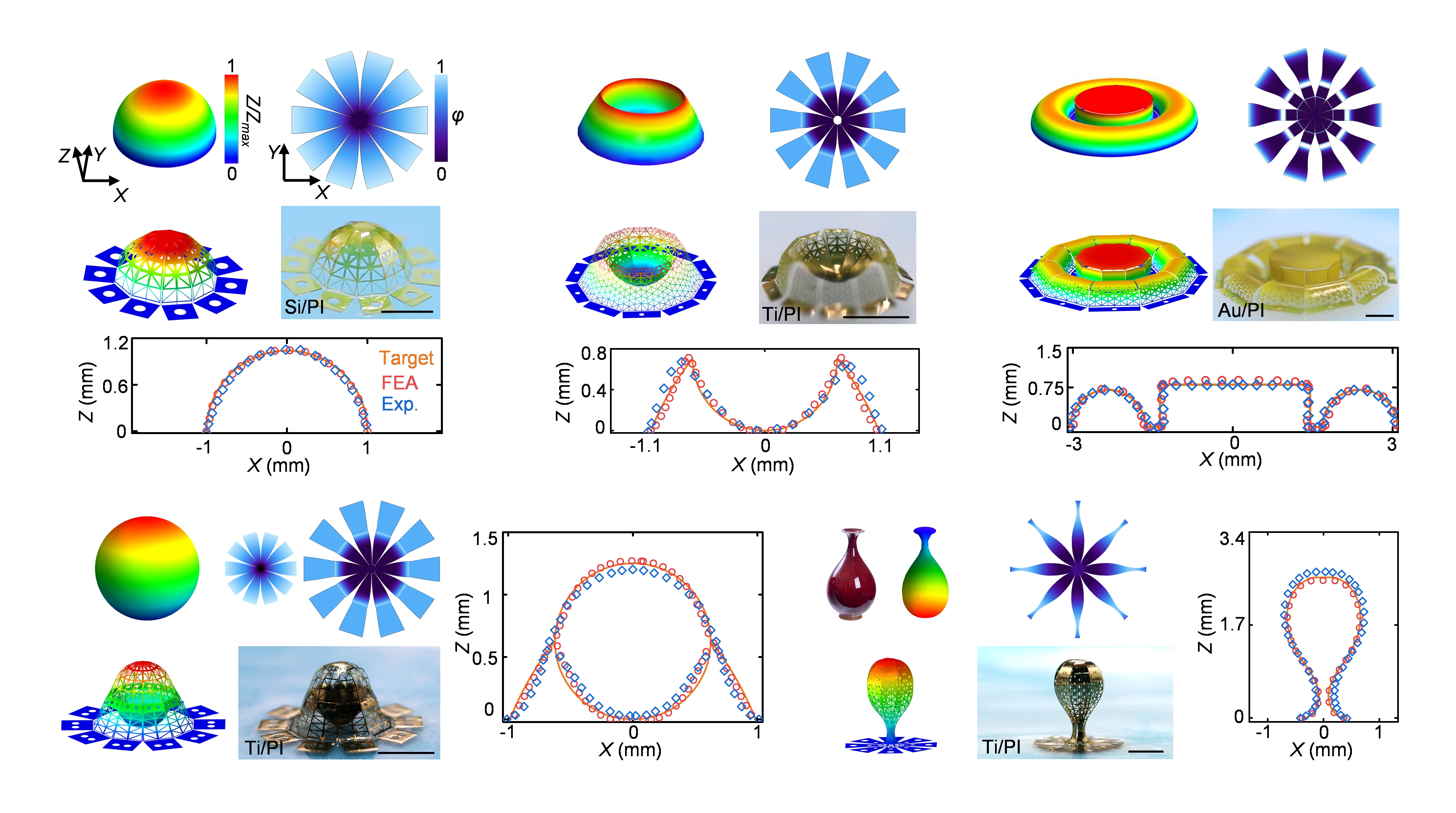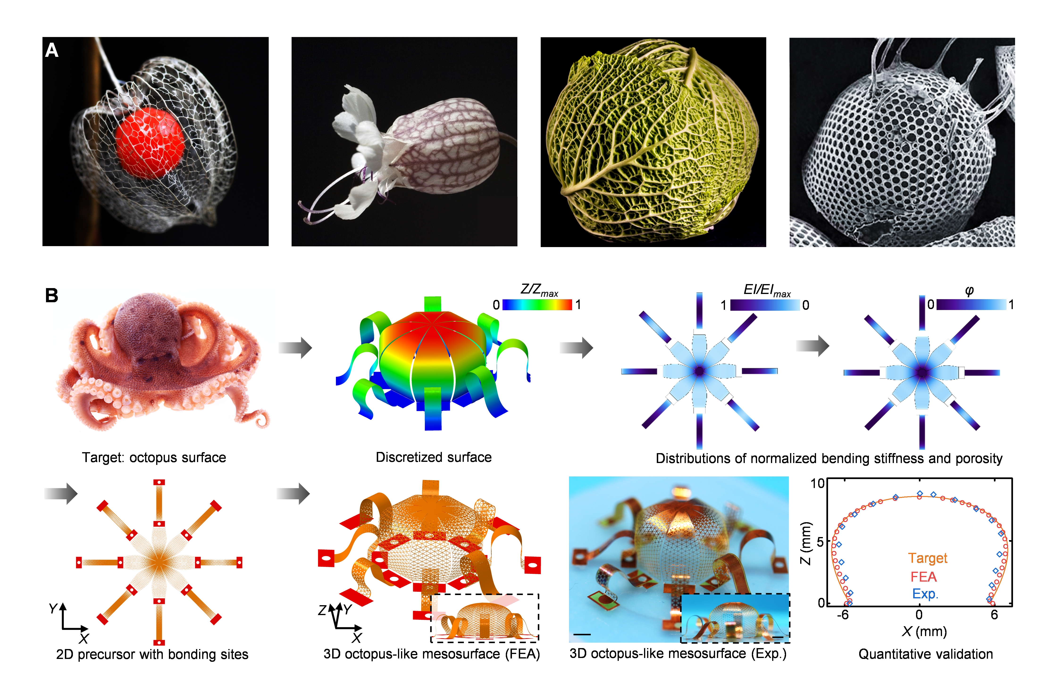 清华新闻网3月27日电 三维多孔微结构在生物体中广泛存在,它们在生物曲面的成型、营养物质的合成与输运、植物生长等方面发挥着多样的、不可替代的作用。由于多孔结构具有轻质高强、高比表面积、优异热学性能等优势,仿生多孔设计在新型材料和器件系统的研制中已得到广泛应用,包括高比刚度/比强度的点阵/泡沫材料,人造组织/器官中的分层血管网络和电磁超材料等。然而,利用仿生多孔微结构来调控三维曲面几何形状方面的研究仍为空白。从应用需求出发,制造具有可定制几何形状的微尺度三维曲面结构及器件,在生物电子学、微型机器人、微纳光学等领域有着重要的应用价值。