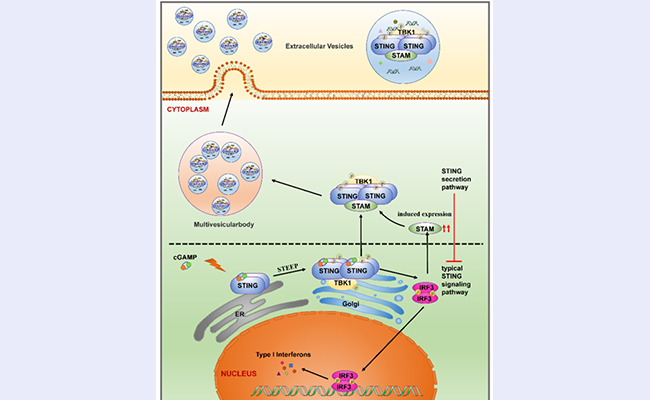 在天然免疫应答中,STING信号通路在抗病毒天然免疫以及肿瘤免疫等过程中发挥重要作用。STING信号通路的精准调控对于机体的免疫稳态至关重要,STING的异常激活可能会导致STING相关幼年发病性血管病变(SAVI)、系统性红斑狼疮(SLE)、Aicardi-Goutières综合征(AGS)等疾病。近年来,诸多研究报道,STING的亚细胞定位(包括溶酶体、自噬小体等)与其信号通路的精准调控密切相关。然而STING在EVs这一广泛参与天然免疫调控的亚细胞结构中的定位与功能却仍所知甚少。
