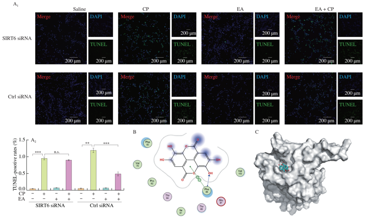 为了进一步确定SIRT6在鞣花酸肾脏保护机制中的作用,研究团队在细胞水平对SIRT6进行敲低,结果发现在SIRT6敲低的肾脏细胞中,鞣花酸预处理不能缓解顺铂诱导的细胞凋亡(图4A);而对照组肾脏细胞中,鞣花酸仍可有效抑制顺铂诱导的肾脏凋亡(图4A)。这表明SIRT6敲低可以消除鞣花酸对肾脏细胞的保护作用,即鞣花酸的肾脏保护作用主要依赖于其对SIRT6的调控作用。