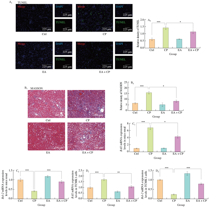 同时,H&E染色(图1B)、TUNEL染色(图2A)及MASSON染色(图2B)也表明,预先给予鞣花酸治疗可有效改善顺铂所引起的肾脏病理损伤、纤维化和细胞凋亡;并且,鞣花酸预处理逆转了顺铂对肾脏组织中凋亡相关因子BAX和Bcl-2的影响(图2C)。这些结果表明,在使用顺铂前预先给予鞣花酸可作为一种改善顺铂肾毒性的有效策略。