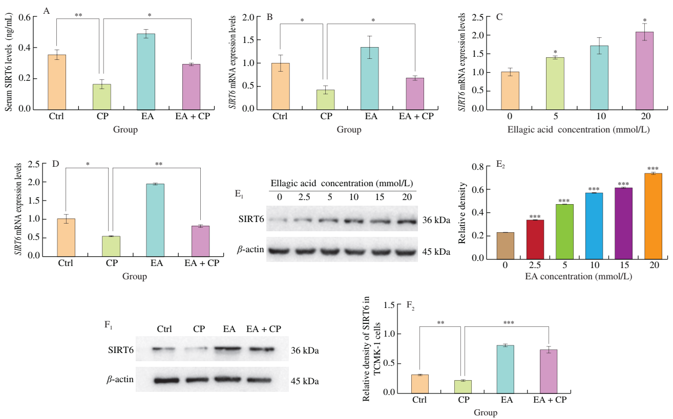 为了探究鞣花酸对顺铂肾毒性的缓解机制,研究团队采用ELISA和qPCR分别检测小鼠血清和肾脏组织中SIRT6的表达水平,结果发现经顺铂处理后的小鼠血清和肾脏组织中SIRT6水平显著降低,而鞣花酸预处理显著逆转了顺铂导致的SIRT6表达下调(图3A和3B)。同时体外实验也显示,鞣花酸以剂量依赖的方式升高肾脏细胞中SIRT6的mRNA和蛋白表达量(图3C和3E),并逆转顺铂引起的SIRT6表达水平降低(图3D和3F)。以上结果进一步证实了SIRT6表达上调可能是鞣花酸发挥肾脏保护作用的分子机制。