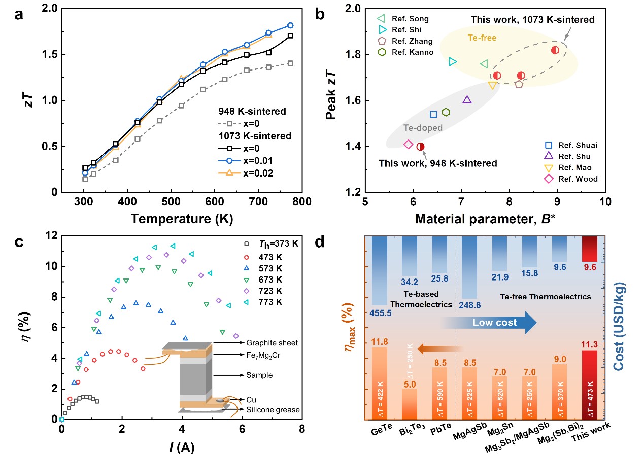 图2. 缺陷调控优化的Mg3(Sb,Bi)2材料的热电性能及能量转换效率