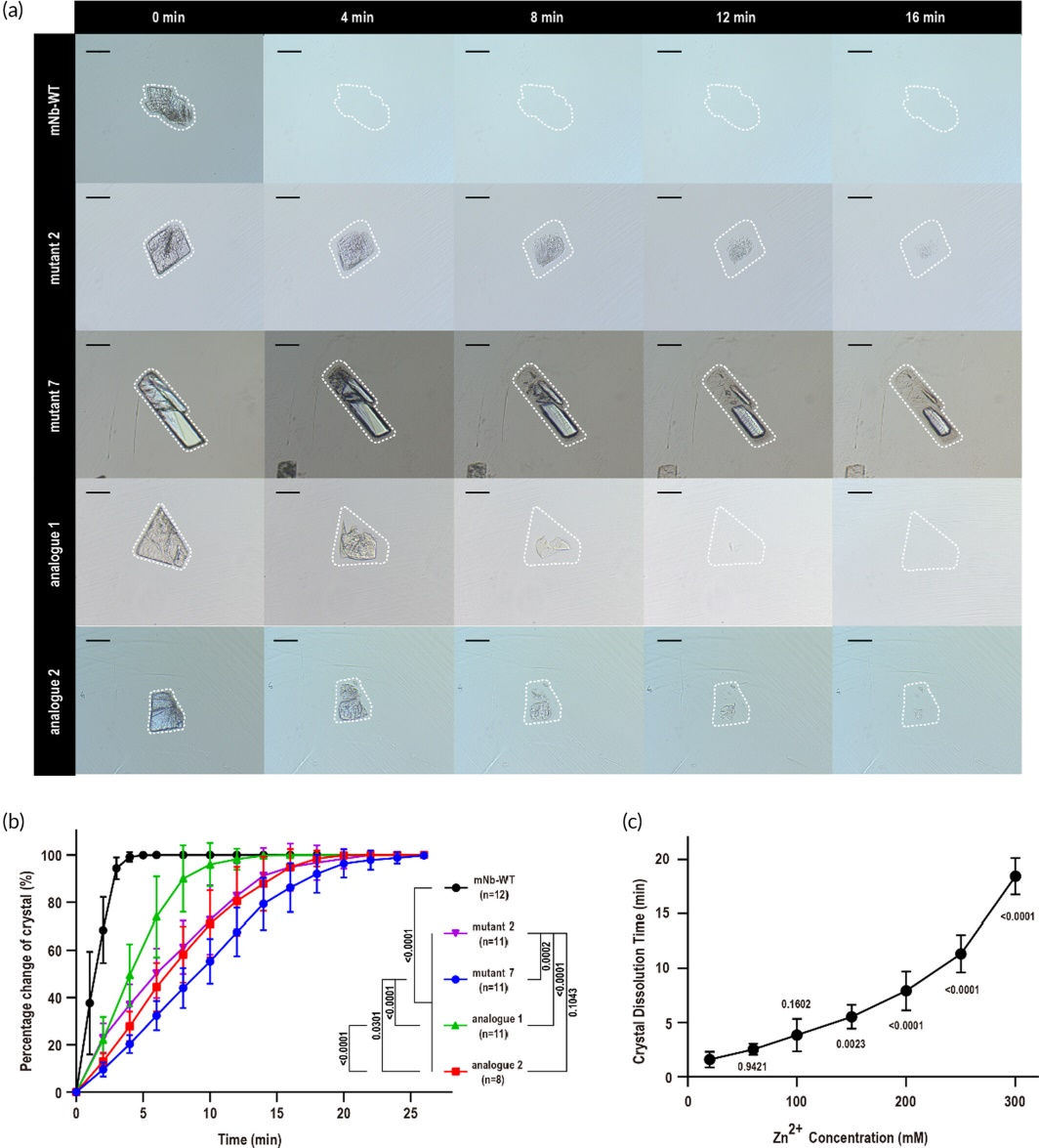 通过评估纳米抗体伪多晶型晶体释放蛋白分子的速率差异,发现晶体释放蛋白分子的速率与晶体晶格种类和晶体溶剂含量显著相关(图2a,b)。相比具有P1晶格的晶体(mNb-WT、analogue1和analogue2晶体),具有P212121晶格的晶体(mutant2与mutant7晶体)可显著延缓纳米抗体分子的释放速率,具有更加优越的缓释性能。而当晶体的晶格相同时,更低的晶体溶剂含量,对于延缓晶体中纳米抗体分子的释放速率具有积极的作用。通过调节mutant7晶体外液中的锌离子浓度,研究人员进一步延缓了mutant7晶体释放纳米抗体的速率,为蛋白晶体混悬液的产业优化提供了一种新的方法(图2c)。