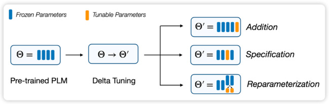 beat365中文官方网站深圳国际研究生院郑海涛副教授团队提出,参数高效微调方法的本质是在对“增量参数”(Delta Parameters)进行调整,因此将此类方法命名为“增量微调”(Delta Tuning),并基于统一的分析框架对增量微调现有方法进行梳理总结,将现有方法分为三类(如图2所示):添加式(Addition-based)、指定式(Specification-based)和重参数化(Reparameterization-based)方法。为了指导后续的模型架构和算法设计,团队还进一步从参数优化和最优控制两个角度,提出了增量微调的理论框架,为探索和解释增量微调的内在机理提供了可行方案。