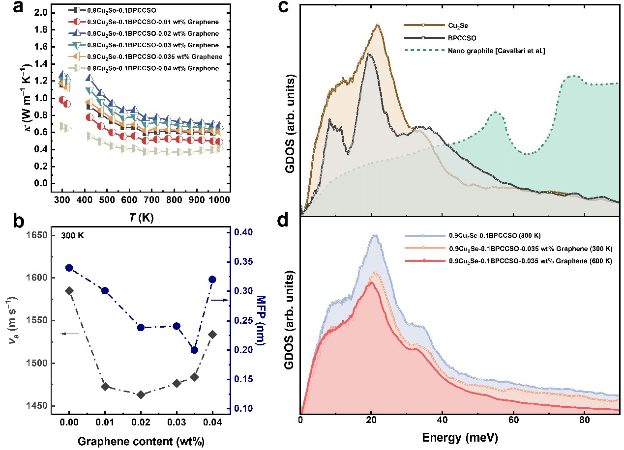热学方面,适量石墨烯的引入增强了对声子的散射作用,由声速测试计算可知声子平均自由程降低。采用非弹性中子衍射技术得到声子态密度,并由此分析声子态密度重叠因子的变化,进一步说明界面在声子输运中的作用(图4)。