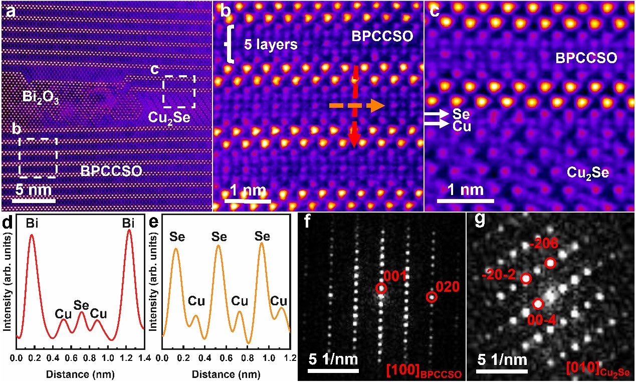 原子尺度下的界面结构分析(图2)表明BiCuSeO与Cu2Se原位复合后,在BiCuSeO的晶格中存在额外的Cu-Se层与Cu层。部分易迁移的亚铜离子被束缚在该结构中,限制了亚铜离子的长程迁移从而提高了Cu2Se的稳定性。此外,不同相之间的界面平滑且在特定方向呈现共格特征,有利于载流子输运同时增强对声子的散射作用。