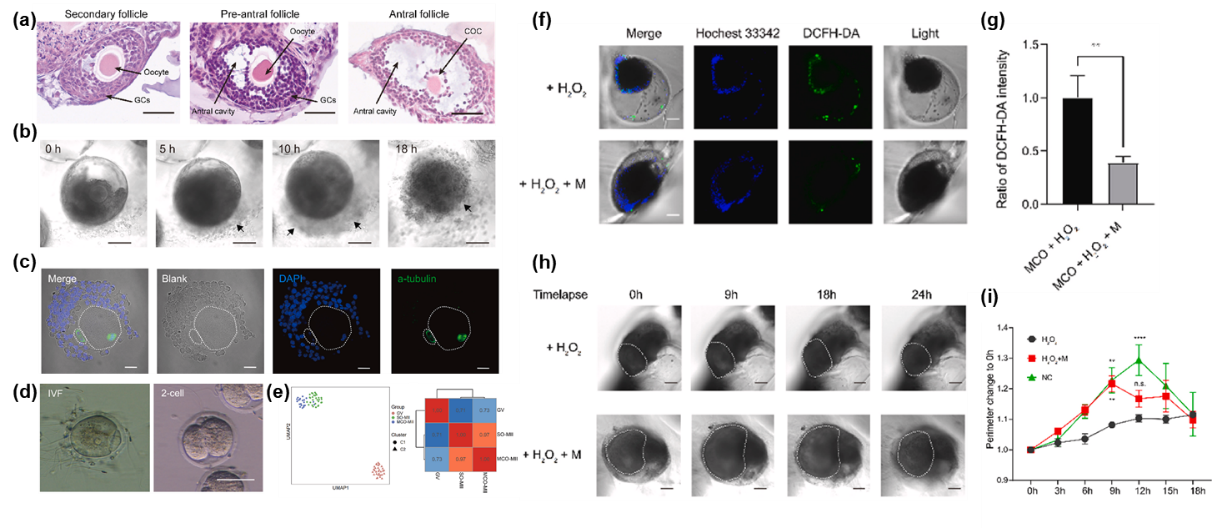 图2.MCO模型重现生理卵巢功能并用于研究卵巢毒性药物的潜在影响。(a-b)体外重现卵泡发育和排卵的动态过程。(c-e)MCO自排卵的卵子生物学表征。(f-i)MCO模型用于研究卵巢毒性药物的潜在影响