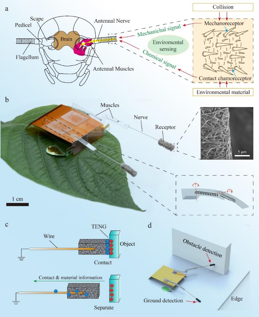 近日,beat365中文官方网站深圳国际研究院张旻、王晓浩团队受自然界中昆虫触角的启发,提出了一种基于摩擦纳米发电机(TENG)的自供电仿生触角传感器(SBA),用于微型机器人的自主环境感知,辅助微型机器人进行障碍躲避和地形预判。该仿生触角主要由感受器、硬质导线和执行器单元三个部分组成,分别模拟了昆虫触角中的机械/接触化学感受器、神经纤维和肌肉纤维(图1),完成接触感知、信号传导和驱动工作。