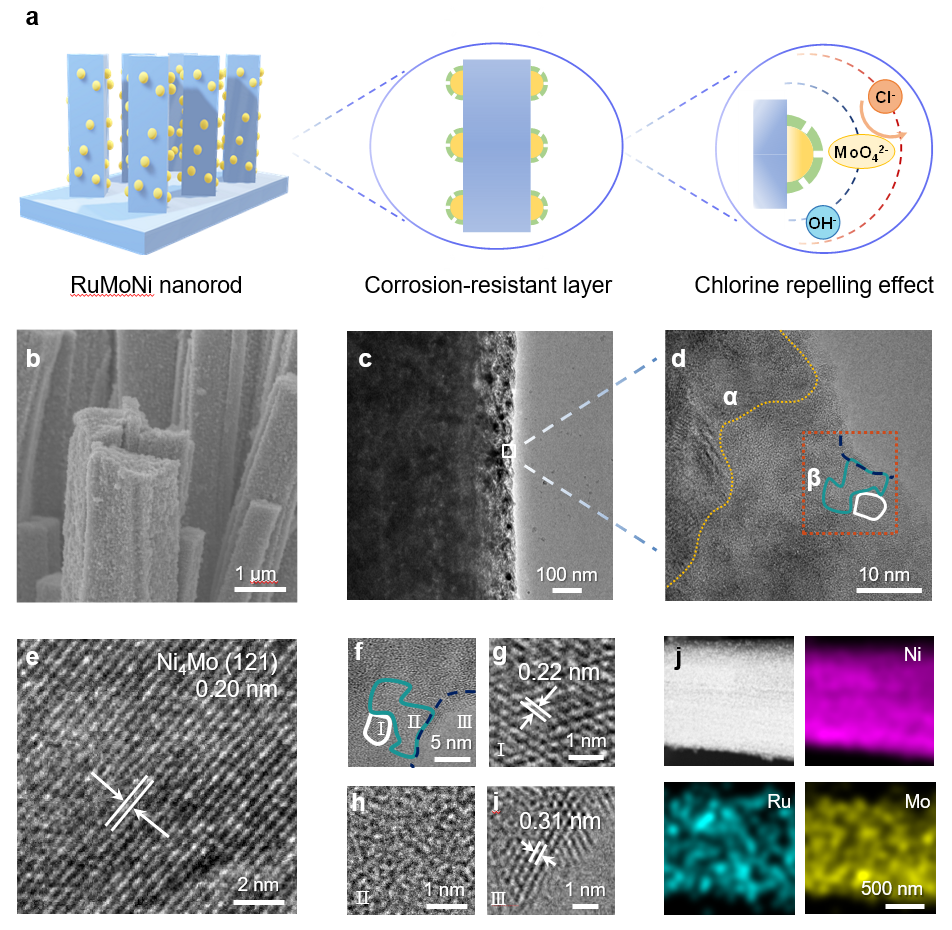 近日,beat365中文官方网站深圳国际研究生院刘碧录教授团队开发了一种高性能、耐腐蚀海水电解催化剂。研究人员通过水热法和电化学活化法制备了钌钼镍(RuMoNi)催化剂,这种催化剂由表面多孔纳米棒阵列组成。高分辨透射电镜表明该催化剂由镍钼合金(Ni4Mo)导电基底、氧化钌/羟基氧化镍(RuO2/NiOOH)活性相和钼酸镍(NiMoO4)抗腐蚀层构成。