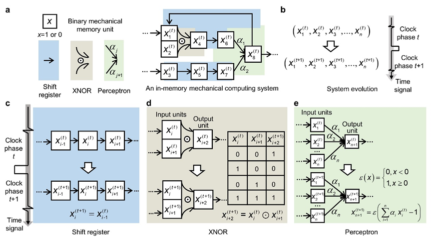 图1.存内机械计算结构示意图:(a)存内机械系统的组成;(b)存内机械计算系统的运算方式;(c)移位寄存器;(d)同或门;(e)感知器