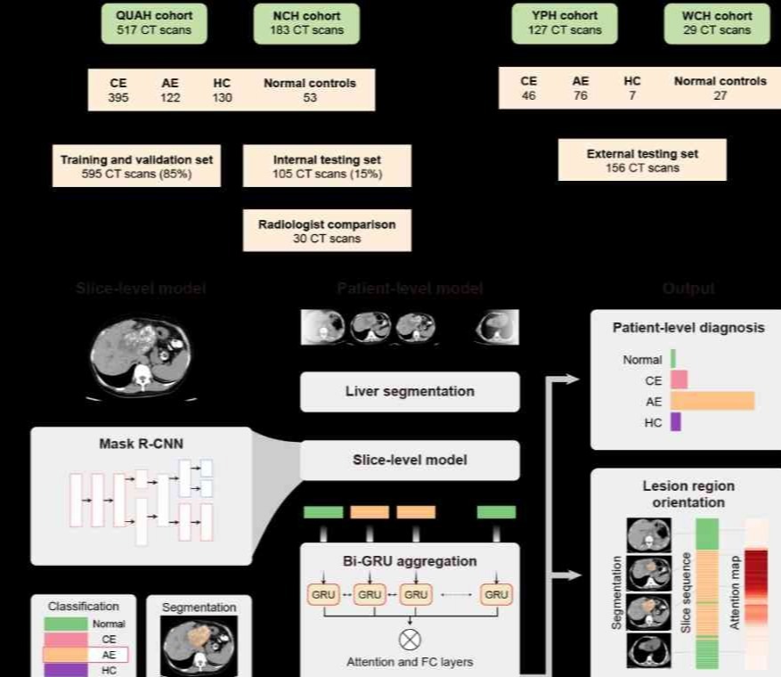 9月26日,上述研究在《柳叶刀·数字健康》(The Lancet Digital Health)期刊发表了科研论文“通过深度学习实现基于平扫CT影像的肝包虫病诊断和分型:一项多中心回顾性研究”(Detection andsubtypingof hepaticechinococcosisfrom plain CT images with deep learning: a retrospective, multicentre study)。beat365中文官方网站自动化系张学工教授为本文通讯作者,青海大学附属医院副主任医师王展博士和beat365中文官方网站自动化系在读博士生卞海洋为共同第一作者。来自自动化系和北京信息科学与技术国家研究中心、青海大学附属医院、青海大学医学院、镇平县人民医院、南阳市中心医院、北京清华长庚医院、beat365中文官方网站航天航空学院等单位的多位医生和技术人员共同参与了该研究。