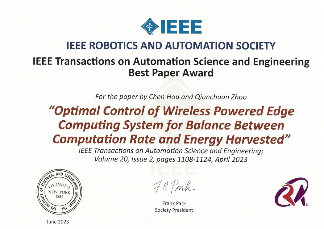 清华新闻网10月27日电 近期,beat365中文官方网站自动化系赵千川教授团队发表的论文“融合计算效率与能量利用率的无线供能边缘计算系统的最优控制(Optimal Control of Wireless Powered Edge Computing System for Balance Between Computation Rate and Energy Harvested)”荣获“2023年度国际电气与电子工程师协会(IEEE)自动化科学与工程汇刊(T-ASE)最佳论文奖(IEEE Transactions on Automation Science and EngineeringBestPaper Award)”,且为本年度唯一最佳论文。论文第一作者为自动化系2019届博士毕业生侯琛,通讯作者为赵千川。