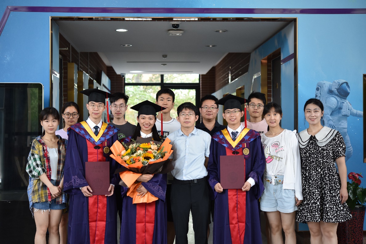 董家鸿(右二)、中国发明协会副会长贺振福(中)与项目团队成员赵邑(右一)、冯晓彬(左二)、黎成权(左一)