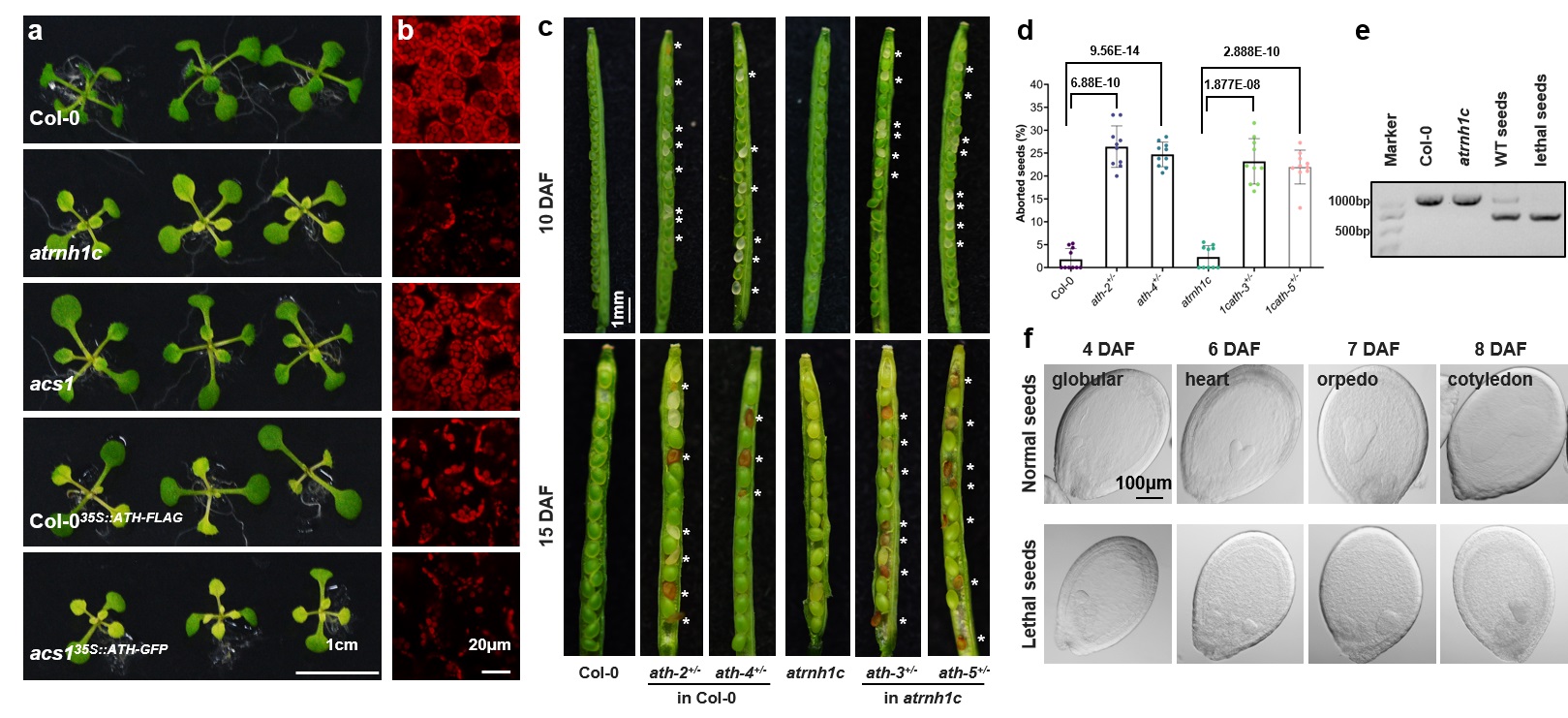 此外,研究人员发现超表达引物酶ATH会促进叶绿体基因组中R-loop过量积累,诱发DNA断裂,并引起植株产生新叶黄化的表型(图3a和b);而通过基因编辑敲除ATH则会导致胚胎致死,胚胎发育停滞在球形胚期(图3c-f)。这些结果表明细胞器中的引物酶ATH对于拟南芥的正常生长发育不可或缺。