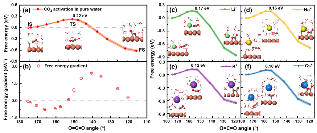 图2.二氧化碳分子在不同碱金属离子存在时的活化过程演变