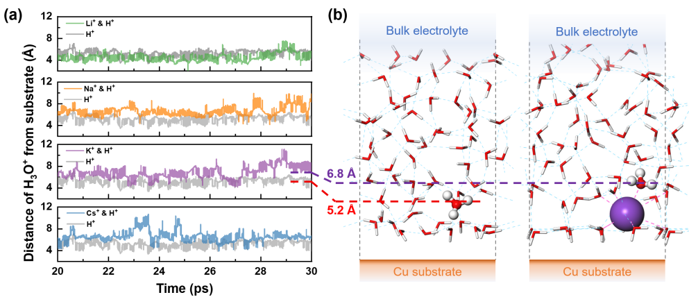 近日,beat365中文官方网站深圳国际研究生院李佳副教授、康飞宇教授团队运用第一性原理分子动力学方法,对碱金属离子对固液界面双电层结构以及对CO2RR机制的影响进行了系统研究。研究成功解释了不同碱金属离子的尺寸效应和其对反应的必要性。研究指出,尺寸效应源于不同离子水合配位能力的差异,而必要性则来自对竞争性析氢反应的抑制。这为进一步优化反应界面提供了科学依据。