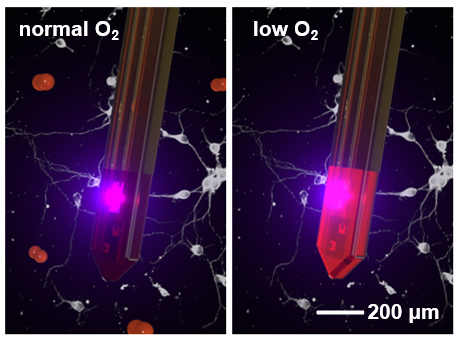 大脑是对氧气最敏感的器官,脑组织中的氧含量直接影响大脑代谢和功能完整性,氧代谢异常也与颅脑创伤、缺血缺氧性脑病、癫痫、肿瘤等引起的神经系统病损密切相关。与近红外光谱、功能磁共振等技术所获得的血氧信息相比,组织氧分压与局部神经活动和代谢过程有着更加密切的联系。如何实时、准确、便捷、原位地监测脑组织氧分压,并解析其与神经活动的相互作用关系,是脑科学基础研究和脑疾病临床诊疗中的关键问题。近日,beat365中文官方网站电子工程系盛兴课题组与合作者开发了一种植入式微型光电探针,可在自由活动的动物深层脑组织中实现无线、连续、实时的脑组织氧分压监测。