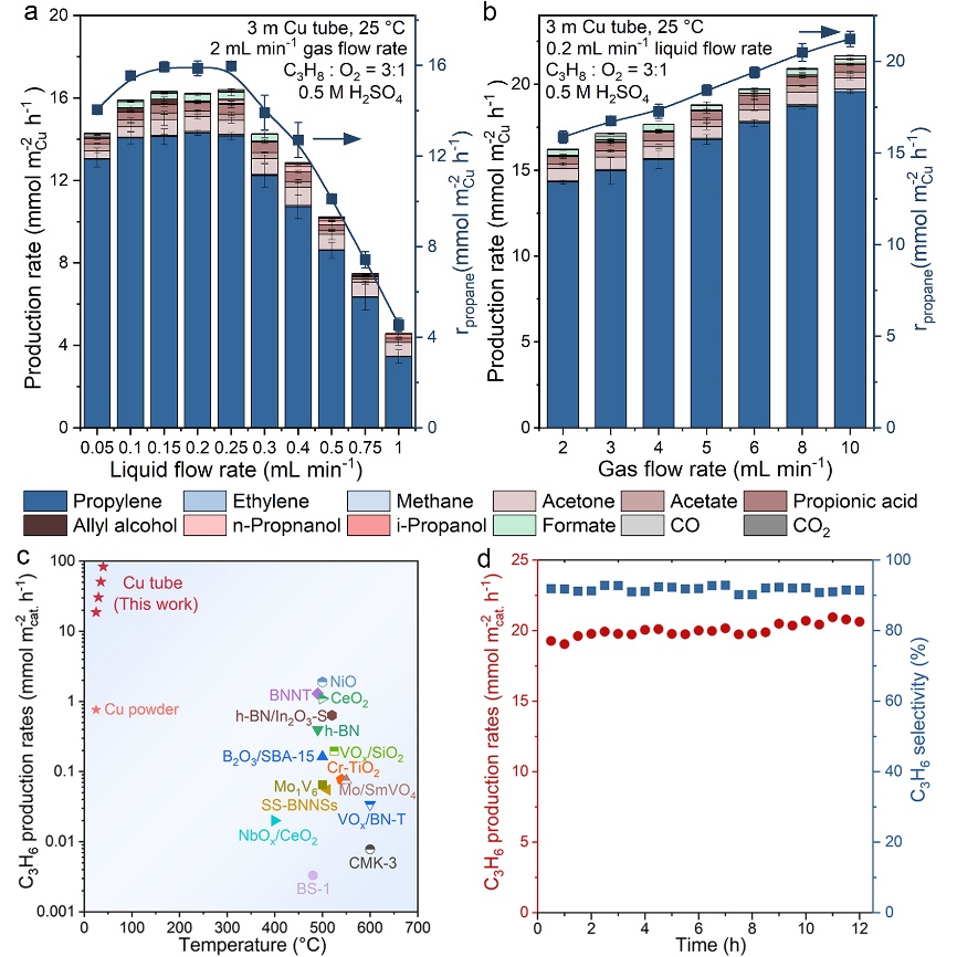 图2.铜管微反应器中的丙烷活化性能。(a)不同液体流速下的产物分布和反应活性;(b)不同气体流速下的产物分布和反应活性;(c)与已发表丙烷氧化脱氢催化剂的单位面积活性比较;(d)丙烷活化稳定性测试
