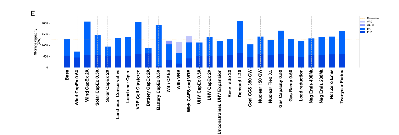 此外,发展储能系统和扩大特高压跨省传输网络是提高电力系统的可再生能源消纳和安全保供能力的重要发展方向。基准情景结果显示,为了保障约60亿千瓦规模的风光消纳,需要建设超过5亿千瓦的抽水蓄能和超过7亿千瓦的电化学储能装机;当允许模型考虑部署以压缩空气储能(20小时放电容量)和液流电池(10小时放电容量)为代表的长时储能技术时,长时储能装机可能达到3亿千瓦的规模。