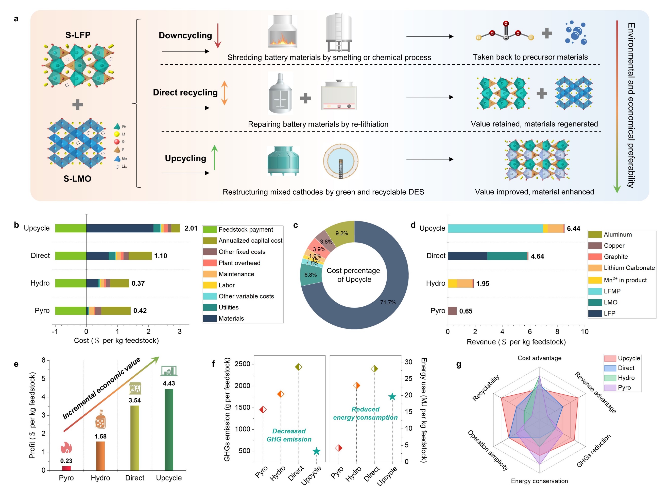 beat365中文官方网站深圳国际研究生院周光敏副教授,中国科学院深圳先进院与金属研究所、深圳理工大学(筹)成会明院士,上海交通大学梁正副教授团队提出了一种针对混合失效正极材料(LFP+LMO)的升级回收策略,以绿色环保的低共熔溶剂为介质,通过结构调控和过渡金属替换,将其转变为更高能量密度的聚阴离子型正极材料。再生磷酸锰铁锂正极材料的中值电压和能量密度分别提升至3.68V(相对于Li/Li+)和559 Wh/kg,均高于商业LFP(3.38 V和524Wh/kg)。该策略可以实现混合正极中的全元素回收和溶剂的循环利用,同时可扩展合成其他高电压磷酸盐材料。经济性分析表明,升级回收策略具有更高的经济和环境效益,为回收低价值的混合正极材料升级为下一代正极材料提供了一种新思路。