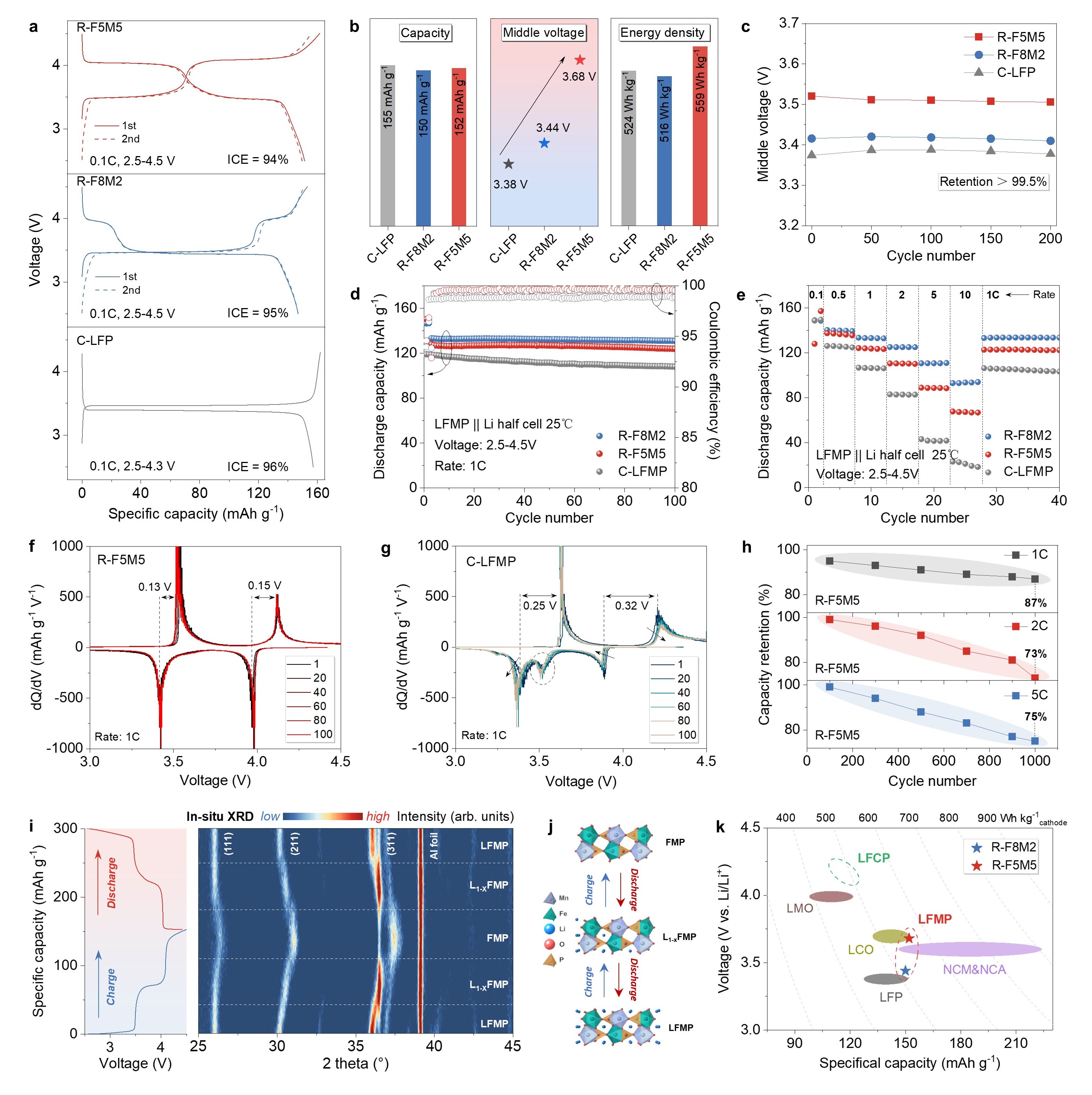 图3.再生的磷酸锰铁锂正极材料的电化学性能